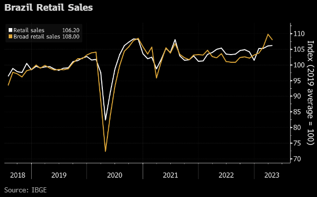 As condições restritas de crédito provavelmente impactaram as vendas no varejo em maio. Uma queda maior nas vendas no varejo em geral – que englobam automóveis e materiais de construção e são mais impulsionadas pelo crédito – é provável. Gráfico Bloomberg